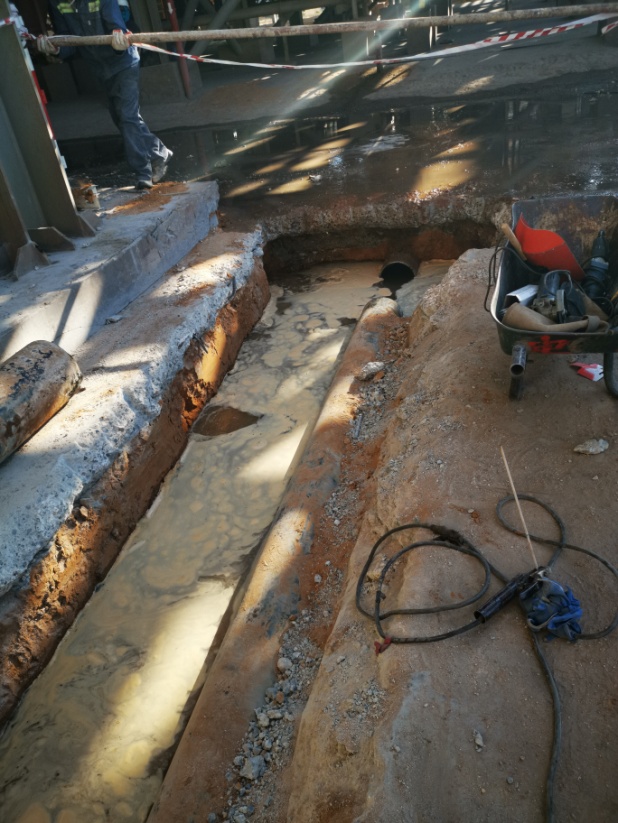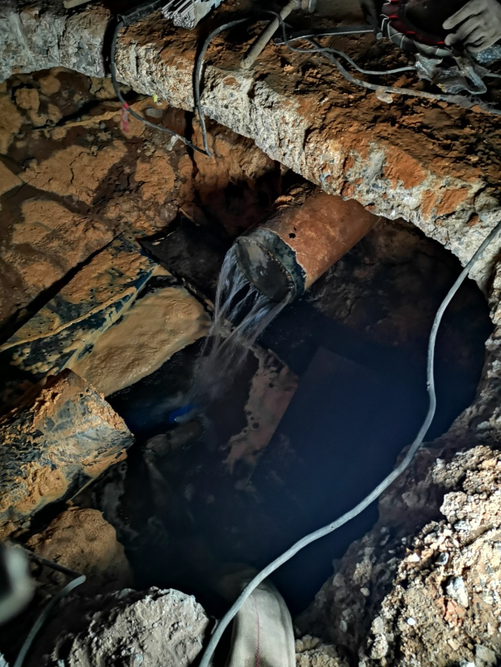 为了防止管沟内发生坍塌,需将管沟内先进行抽水,同时也得想办法将管道内排水尽量减小。我们把预先安装好的排水泵开起来,同时施工组长崔建卫把一块木板切成与管道内径差不多的圆板塞在管道内,不能完全堵住流水,但大大减小了管道的排水量。