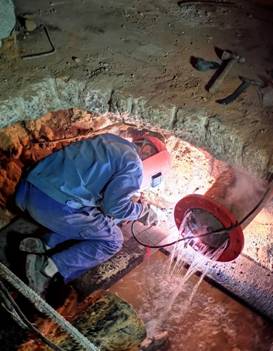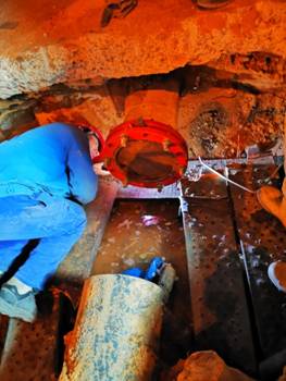 割管之前,先检查了一下管道的外表皮温度,以证实管道内介质的温度,同时也可以估计出管道内介质的存量,确认可以切割后,开始用角向砂轮进行切割,当切到管子底部的时候,由于里面还有一定量的存水,再使用角向砂轮切割会有触电的危险,于是改用氧乙炔割炬切割,带水作业的切割,难度也是很大的,用了差不多是正常作业10倍的时间才把剩余部分的管壁切割开,整个割管的时间就差不多用了两个小时。刚刚把管道割完,管道内的水流开始增大,10分钟后流量就已经达到满管了,这说明运行的机组开始排水了。